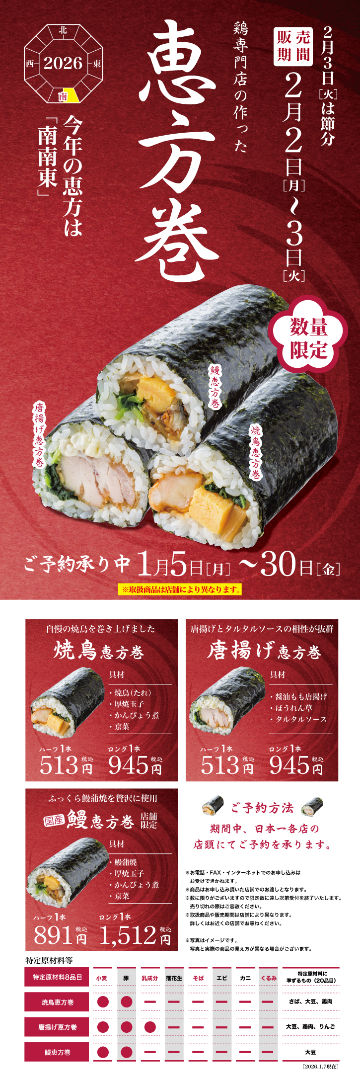 2026.01.08 TOPICS 恵方巻 ご予約開始 記事カテゴリ MENU TOPICS 店舗リニューアル情報 店舗新店オープン 新着記事 記事カテゴリ 2026年 2025年 2024年 2023年 2022年 2021年 2020年 2019年 2018年 お店を探す 都道府県から探す 一覧から探す フリーワード 検索 近隣から探す